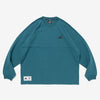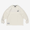 ドライな質感の空紡糸を度詰で編んだコットン天竺を使用したロングスリーブシャツ。幅広の前後身頃を上下に切り替え、ドロップショルダーに仕立てたDESCENDANTの定番カットソー。左胸にCETUS、バックヨークにDescendant、両袖に波模様のグラフィックをプリント。襟ぐりの継ぎ目にはオリジナルテープのパイピング。右前裾にサイズを表示したCETUSの織りネーム付き。