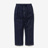 アメリカで創業した日本のヴィンテージワークウェアブランド、Post O’Alls(ポストオーバーオールズ)とのコラボレーション。8ozデニムを使用し、白糸のステッチでアクセントを効かせたワークトラウザーズ。ワンタックの腰回りから裾口へゆったりテーパードしたシルエット、ゴム入りのウエストに共地のベルトを通し、前身頃の左右に両玉縁ポケット、背面にシンチバック付き。