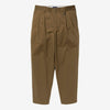 生地目の詰まったオーガニックコットンカツラギを使用したDC-3ツイルトラウザーズ。ツータックの腰回りから裾口へゆったりテーパードしたシルエット、斜め間口のサイドポケット及び片玉縁のヒップポケットを配し、背面にボックスロゴのパッチ、ベージュのみKhaKeeのピスネーム付き。腰帯のスレキには「DC-3 | Wide」及びベージュのみ「KhaKee」のプリント。