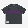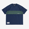 コットン天竺を使用し、前後身頃にチャコール/パープル、ネイビー/グリーンのパネルを切り替えたショートスリーブカットソー。パネルの前後にOTCロゴを刺繍。ゆったりした身幅のシルエット。襟ぐりの継ぎ目にはオリジナルテープのパイピング。右前裾にサイズを表示したCETUSの織りネーム付き。