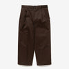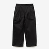生地目の詰まった高密度コットンウエポンを使用したSFワイドトラウザーズ。ツータックの腰回りから裾口へワイドなままのストレートシルエット、斜め間口のサイドポケット及び片玉縁のヒップポケットを配し、背面にクロスパドルの織りネーム付き。腰帯のスレキには「SF | Wide」のプリント。