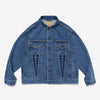 13ozデニムを使用し、ウォッシュ加工を施したトラッカージャケット。ゆったりした身頃の両胸に山型のフラップポケットを設け、その下にサメの歯や波模様をモチーフにした刺繍を施す。身頃の左右にハンドウォーマーポケット、腰帯にアジャスターボタンとDWU仕様のネーム付き。